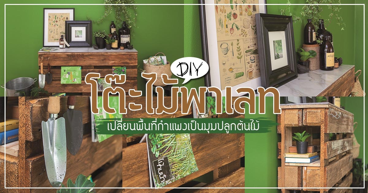 โต๊ะไม้พาเลทสไตล์ทรอปิคอล เปลี่ยนพื้นที่กำแพงเป็นมุมปลูกต้นไม้