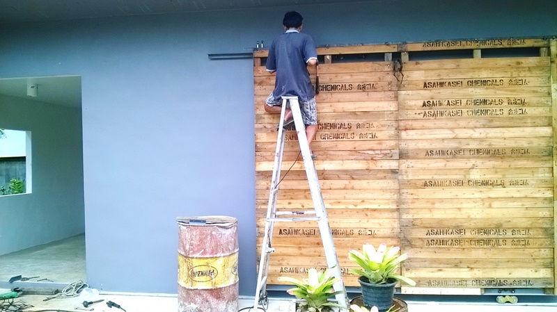 - ทำประตูต่อครับ ผมออกแบบ ใช้ไม้พาเลทเพราะราคาถูก
