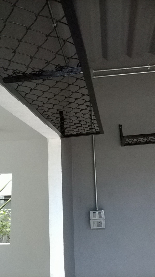 ใช้เป็นหลังคา ทาสีเดียวกับผนังเลย เดินสายไฟในท่อเหล็ก หลอดไฟแบบโคมกระบอก