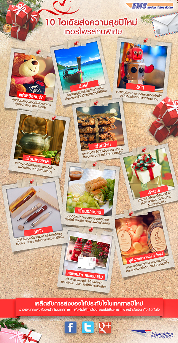 และนี่ก็คือไอเดียมอบของขวัญปีใหม่ให้กับคนพิเศษที่สามารถนำไปปรับใช้กับคนใกล้ตัวได้นะคะ แต่หากคนพิเศษของคุณอยู่ไกล จนไม่สามารถมอบของขวัญประทับใจให้กับมือได้ การส่งของขวัญผ่านไปรษณีย์ไทย ก็เป็นอีกหนึ่งทางเลือกดี ๆ เพราะสามารถส่ง EMS ได้ทุกสถานที่ ทั้งในกรุงเทพฯ ต่างจังหวัด รวมถึงต่างประเทศ และหากใครเลือกวิธีส่งของขวัญปีใหม่ด้วยไปรษณีย์ก็อย่าลืมเผื่อเวลาในการส่งไว้แต่เนิ่น ๆ นะคะ เพราะเป็นช่วงเทศกาลซึ่งอาจมีคนส่งของขวัญเป็นจำนวนมาก อีกทั้งยังมีวันหยุดทำการของไปรษณีย์ด้วยจ้า