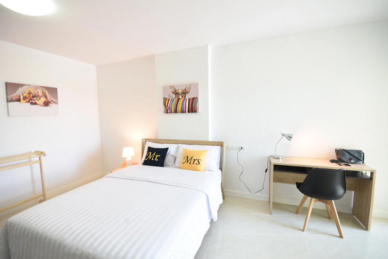 - มาดูห้องนอนต่อเลยค่ะ เฟอร์นิเจอร์ห้องนอนได้มาจาก Koncept เนื่องจากห้องนอนค่อนข้างใหญ่ ก็เลยใส่โต๊ะทำงานเข้าไปด้วย หากผู้เช่าอยู่อาศัยกันสองคนก็จะได้มีมุมส่วนตัวบ้าง คนหนึ่งอาจอยู่ห้องนั่งเล่น อีกคนก็อยู่ในห้องนอน ส่วนตรงปลายเตียงก็คือมุมแต่งตัว เลือกซื้อกระจกติดผนังที่ส่องได้ทั้งตัว แล้วก็ซื้อชั้นเล็ก ๆ อันนี้มาไว้วางเครื่องใช้ต่าง ๆ เป็นโต๊ะแป้งย่อม ๆ สำหรับสาว ๆ ที่แต่งหน้านานก็ไม่ต้องกลัวเมื่อยนะคะ เก้าอี้ทานข้าวมีสามตัว ไปลากมานั่งสักตัวก็ได้ค่ะ ส่วนตัวดิฉันไม่ชอบโต๊ะเครื่องแป้งเลย มันดูเป็นผู้หญิงเกินไป ถ้าเกิดคนเช่าเป็นผู้ชายแล้วมีโต๊ะเครื่องแป้งอยู่มันดูไม่แมนยังไงพิกลค่ะ ผู้ชายแมน ๆ มีโต๊ะเครื่องแป้ง นึกภาพการใช้ไม่ออกค่ะ 555