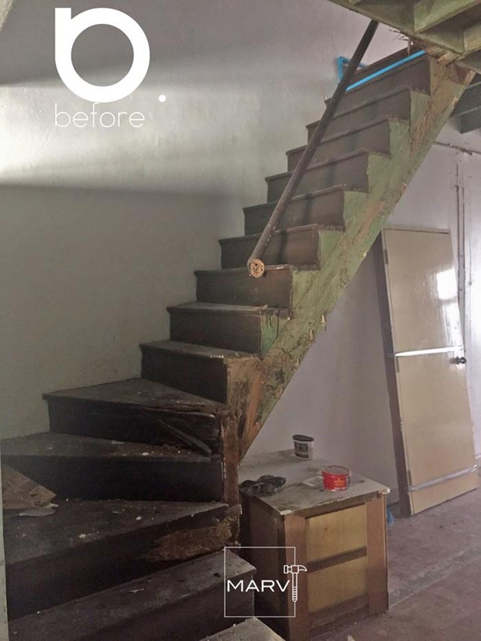 ส่วนบันไดก็มีการปรับปรุงใหม่ โดยจากเดิมเป็นแบบรูปตัวแอล (L Shape) ก็ปรับให้เป็นรูปตัวไอ (I Shape) เพื่อให้เดินต่อไปยังชั้น 3 ได้สะดวกและกินพื้นที่ใช้สอยส่วนกลางให้น้อยที่สุด พร้อมกับตกแต่งด้วยสีดำตัดกับผนัง เกิดเป็นความสวยงามที่เรียบง่าย