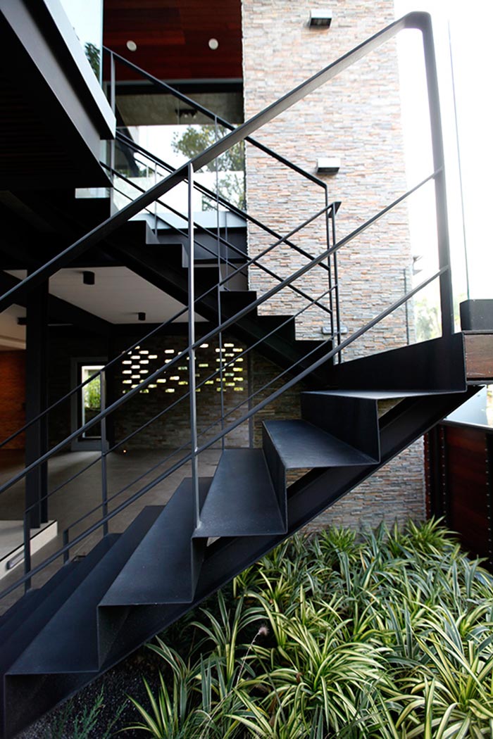 - งานบันไดหน้าบ้านครับ วางแม่บันไดเพื่อรับน้ำหนักเหล็กขั้นบันได นำเหล็ก H-beam ที่เหลือมาทำเป็นคานรับเคาน์เตอร์ เทผนังปูนด้านข้างไว้รับน้ำหนักและเป็นดีไซน์