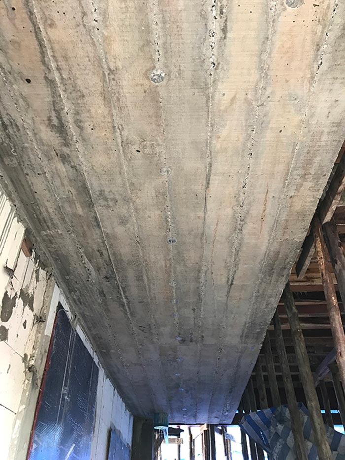 - ส่วนรางรับน้ำที่ทำการเปลือยท้องปูนด้วยการใช้ไม้แบบ 4 นิ้ว มาเรียงต่อกันเป็นลาย พอแกะแบบแล้วก็จะดิบ ๆ แบบนี้ครับ พองานพื้นหลังคาเสร็จแล้วก็เริ่มเห็นโครงบ้านชัดขึ้น