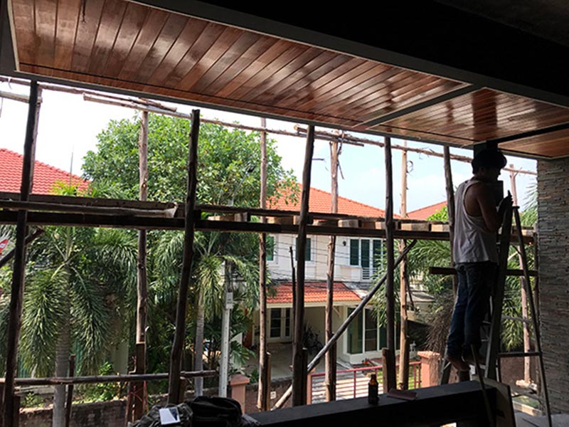 - ติดตั้งไม้ระแนงส่วนหลังคากันสาด งานไม้เสร็จแล้วก็เริ่มงานย้อมสี โดยส่วนตัวผมชอบสีใส เพื่อโชว์ลายไม้