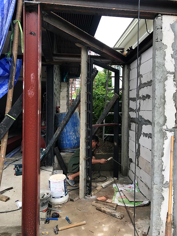 - เสา H-Beam ที่ทำการรื้อถอนจากโครงโรงรถเดิม ไม่ได้ทิ้งนะครับ แต่จะนำมาใช้ในโครงสร้างส่วนอื่น ๆ ต่อไป ผมต้องวางแผนเอามาใส่ในแบบงานอีกครั้ง ส่วนงานโครงสร้างเพิ่มเติมก็สั่งเหล็กมาเพิ่มเติมตามขนาดที่ต้องใช้ พร้อมการทาสีรองพื้นไว้ 1 ชั้น ก่อนติดตั้ง พอฤกษ์งามยามเช้าก็ได้เวลาตั้งเสาขึ้นไปแล้วครับ งานนี้ใช้ความชำนาญ เพราะไม่ได้ใช้เครน พองานเสาเสร็จ งานคานก็มาต่อ ส่วนนี้ใช้เหล็ก I-Beam ฐานเอียง ขนาด 35 เซนติเมตร เป็นส่วนคานรับน้ำหนัก เหล็กลักษณะนี้ใช้สำหรับรับพลังงานจลน์ เช่น ใช้ทำเครนหรือคานที่มีแรงกระทำตลอดเวลา ซึ่งเทียบจากโครงสร้างบ้านทั่วไปอาจจะเกินความจำเป็น แต่งานนี้วิศวกรขอเอาชัวร์