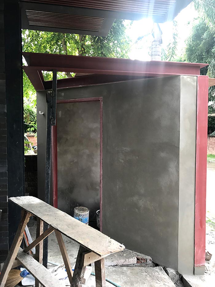 - งานบ้านคืบหน้าไปได้ 70-80% แล้ว ก็เริ่มส่วนงานประตูนอกบ้านและซุ้มทางเข้า นำเหล็กที่เหลือจากโครงสร้างมาใช้ ด้านข้างทำการตั้งโครงเหล็กเพื่อเป็นระแนงบังตาและชั้นลอยสำหรับวางของ