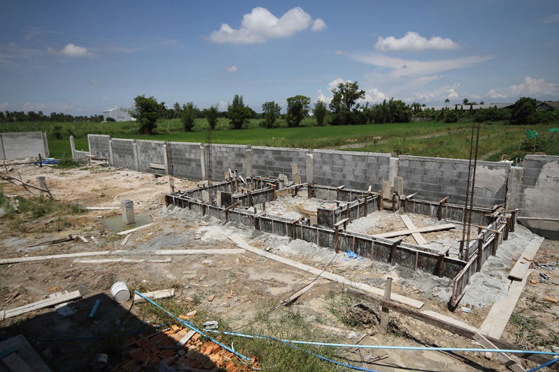 - เสร็จแล้วก็เริ่มก่ออิฐ โดยจะใช้อิฐแดงทั้งหลัง กินเวลาประมาณ 3 เดือน