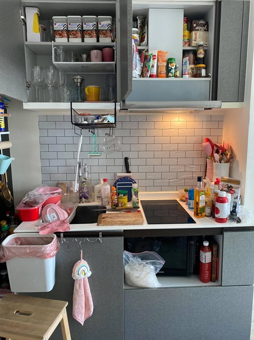 สำหรับคนที่ชอบใช้ของตรงไหนแล้ววางไว้ตรงนั้น จนตอนนี้ห้องครัวรกจนสภาพเกือบจะกลายเป็นมินิมาร์ทย่อม ๆ เต็มไปด้วยของวางกระจายเต็มเคาน์เตอร์ ไม่ว่าจะเป็นจานชาม ช้อน-ส้อม เครื่องครัว และเครื่องปรุง กองรวมกันเต็มไปหมด เหมือนกับอดีตห้องครัวของคุณ Elle Phanglangphon มาจัดของใหม่พร้อม ๆ กันให้เป็นห้องครัวสไตล์มินิมอลกันเถอะ