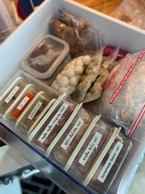 - ของสดในตู้เย็นก็แพ็กใส่กล่องพลาสติกก่อนเก็บ พร้อมกับติดแท็กชื่ออาหารและวันหมดอายุเอาไว้กันลืม