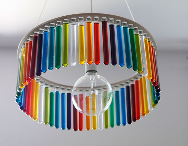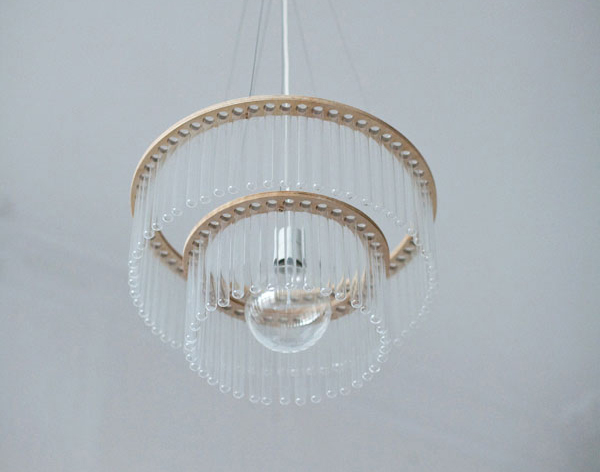 โดยการนำหลอดทดลองเปล่า ๆ มาเรียงกันบนแผ่นไม้ทรงกลมล้อมรอบหลอดไฟเอาไว้ ช่วยให้แสงไฟที่สะท้อนออกมามีประกายดูสวยงามมากยิ่งขึ้น แถมยังสามารถนำของอื่น ๆ มาประดับเพื่มลงไปในหลอดเพื่อเปลี่ยนสไตล์ของโคมไฟก็ได้ เช่น ต้นไม้ ดอกไม้ น้ำหลากสี เป็นต้น นอกจากนี้ยังสามารถปรับเปลี่ยนความหรูหราด้วยการเพิ่มชั้นระดับเป็นหลาย ๆ ชั้น ก็ยิ่งทำให้ดูน่าสนใจไม่น้อยเลยทีเดียว